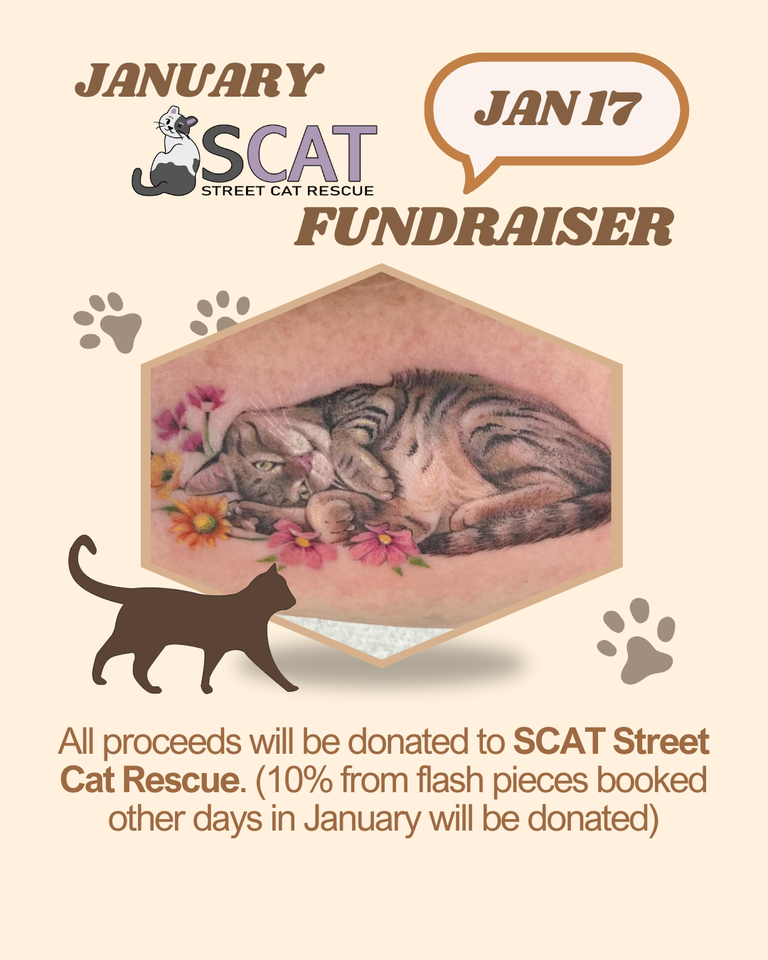 On January 17th, all proceeds from kitty themed flash and customs will be donated to SCAT Street Cat Rescue, and 10% from all other kitty themed flash and customs tattooed in the month of January will be donated as well!